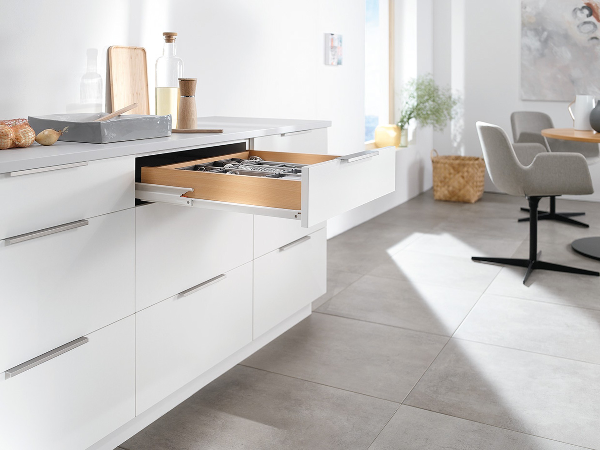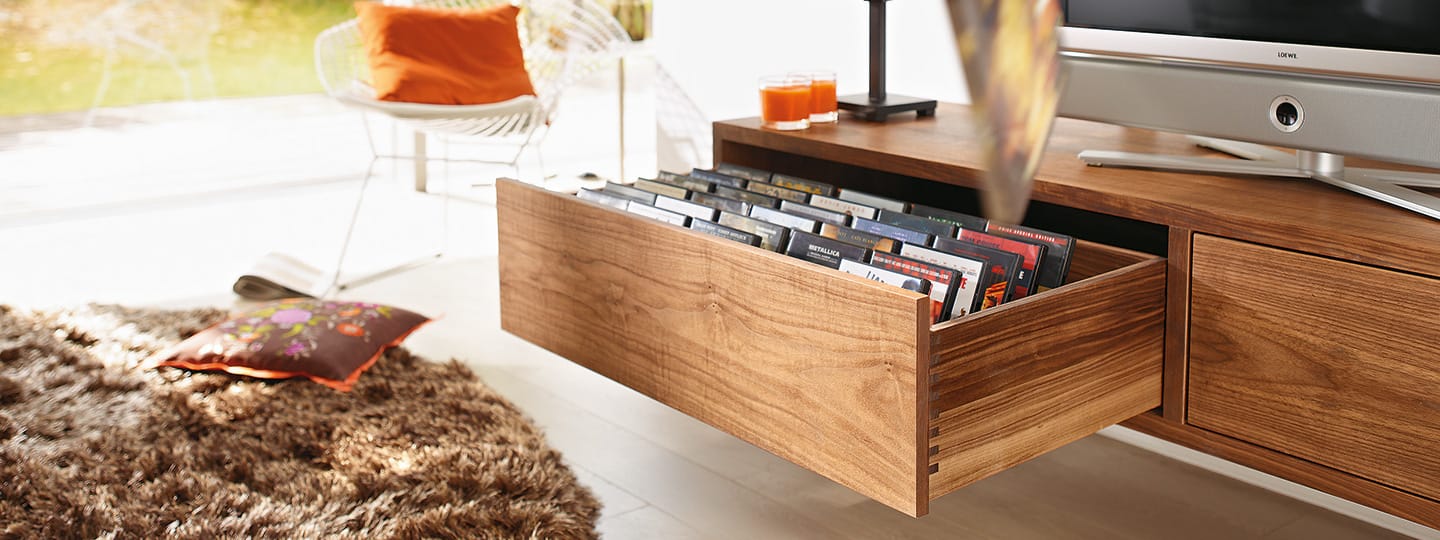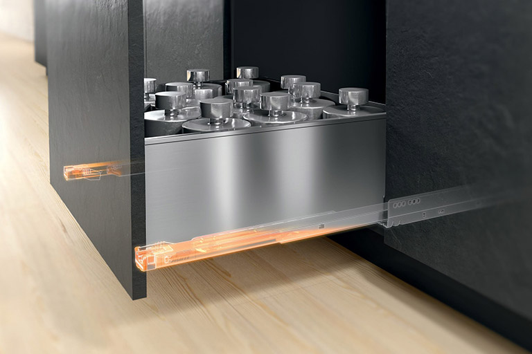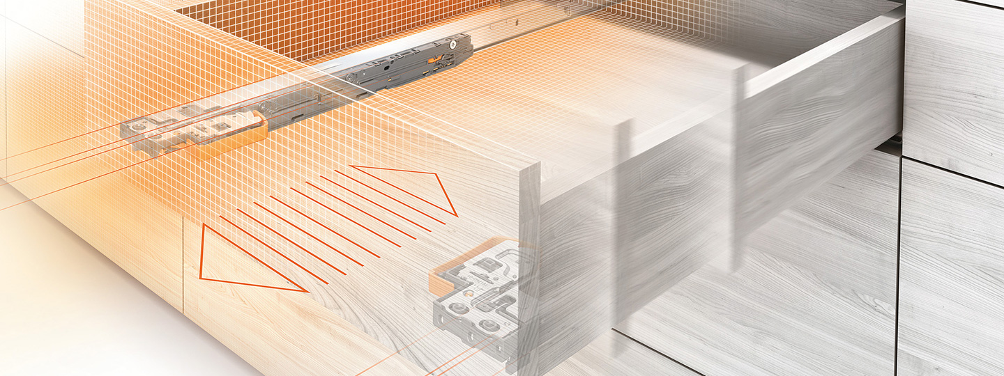 Kryte prowadnice zapewnią komfortową obsługę, a także płynny ruch mebla. System Tandem świetnie sprawdza się w meblach drewnianych.