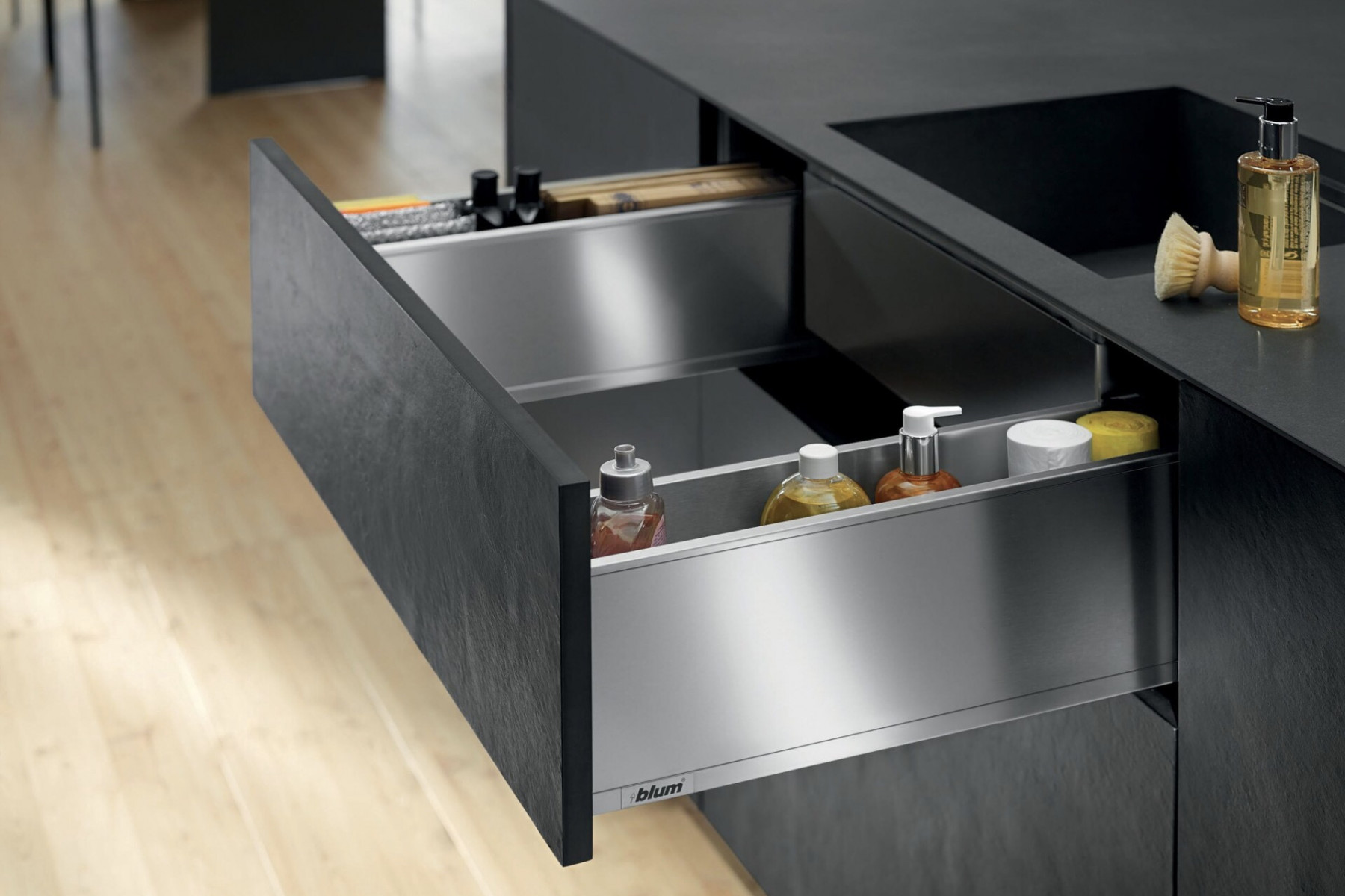 Szuflada pod zlewem, która ergonomicznie zaplanuje ustawienie przyborów do zmywania.